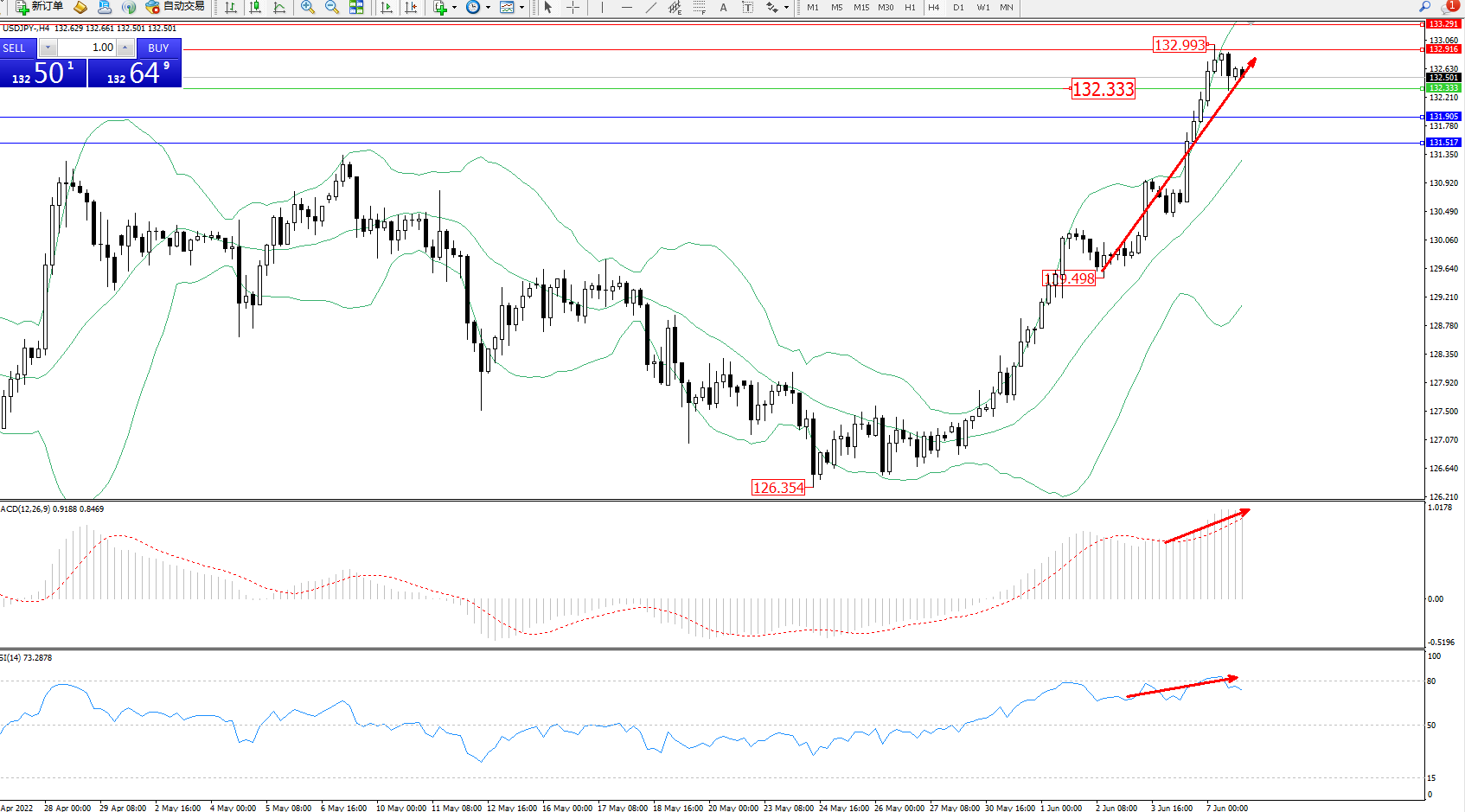 技术点评:多头动力延续布林带指标上轨附近持续震荡上扬,高位抵达132.993附近届点后整理,短期多头动力依旧有进一步向上拉升态势,布林带指标呈张口走势后开始缓慢有收口迹象,MACD指标处于多头区域维持震荡不断上移中,RSI指标处于多头区域超买区80均衡线附近窄幅整理;