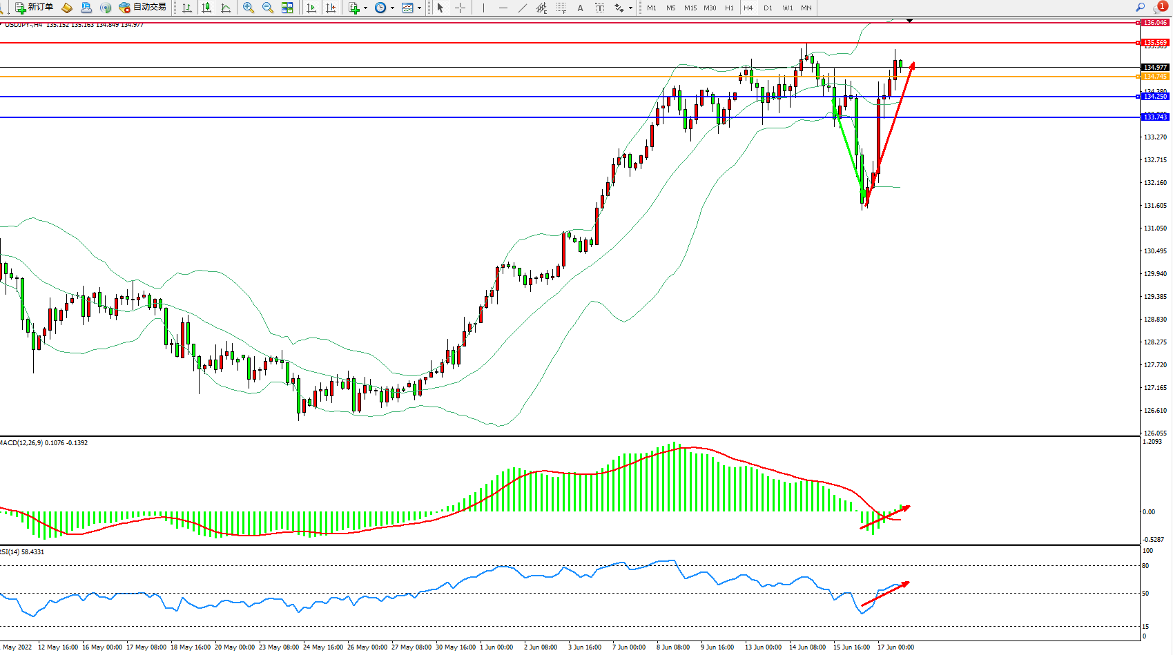 4小时图看:高位空头动力急速下挫后呈V型反转走势强势上扬,处于布林带指标中上轨区间震荡拉升,布林带指标呈张口走势后开始收口平移,MACD指标处于空头区域维持震荡上移至0轴线上側徘徊,RSI指标处于50均衡线上側缓慢上移;