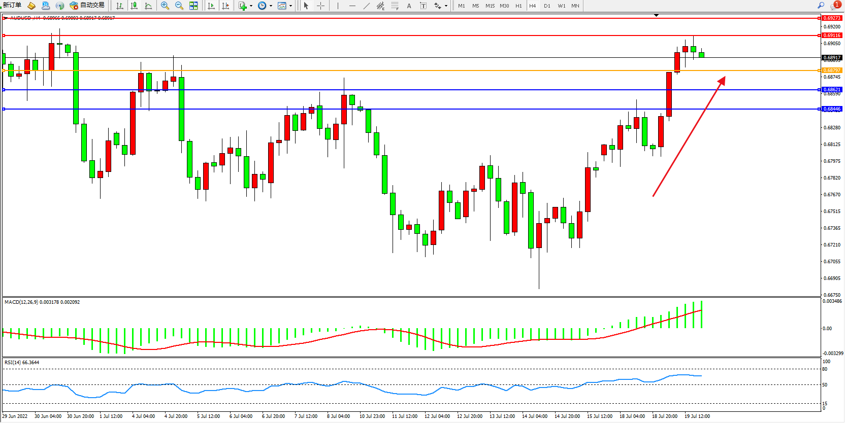 交易策略:0.68797上方看涨,目标0.69116、0.69273
