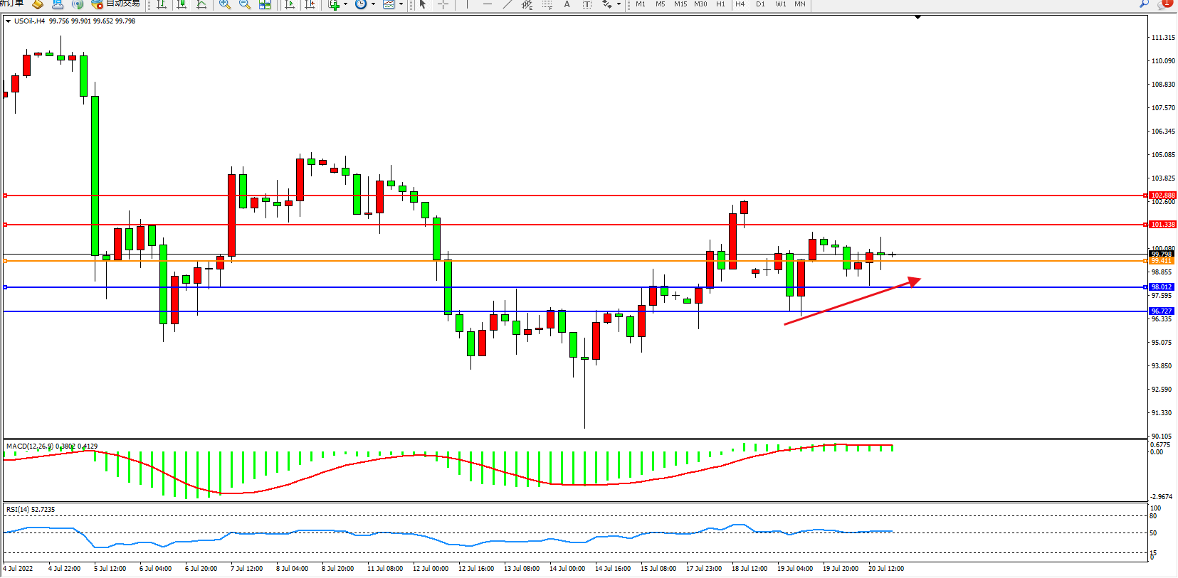 原油维持99.798附近震荡,美国至7月15日当周EIA战略石油储备库存为1985年7月12日当周以来最低。截至7月15日当周EIA原油库存意外减少,汽油库存增加,NYMEX原油波动0.6美元,低点高点分别为98.59美元和99.20美元。