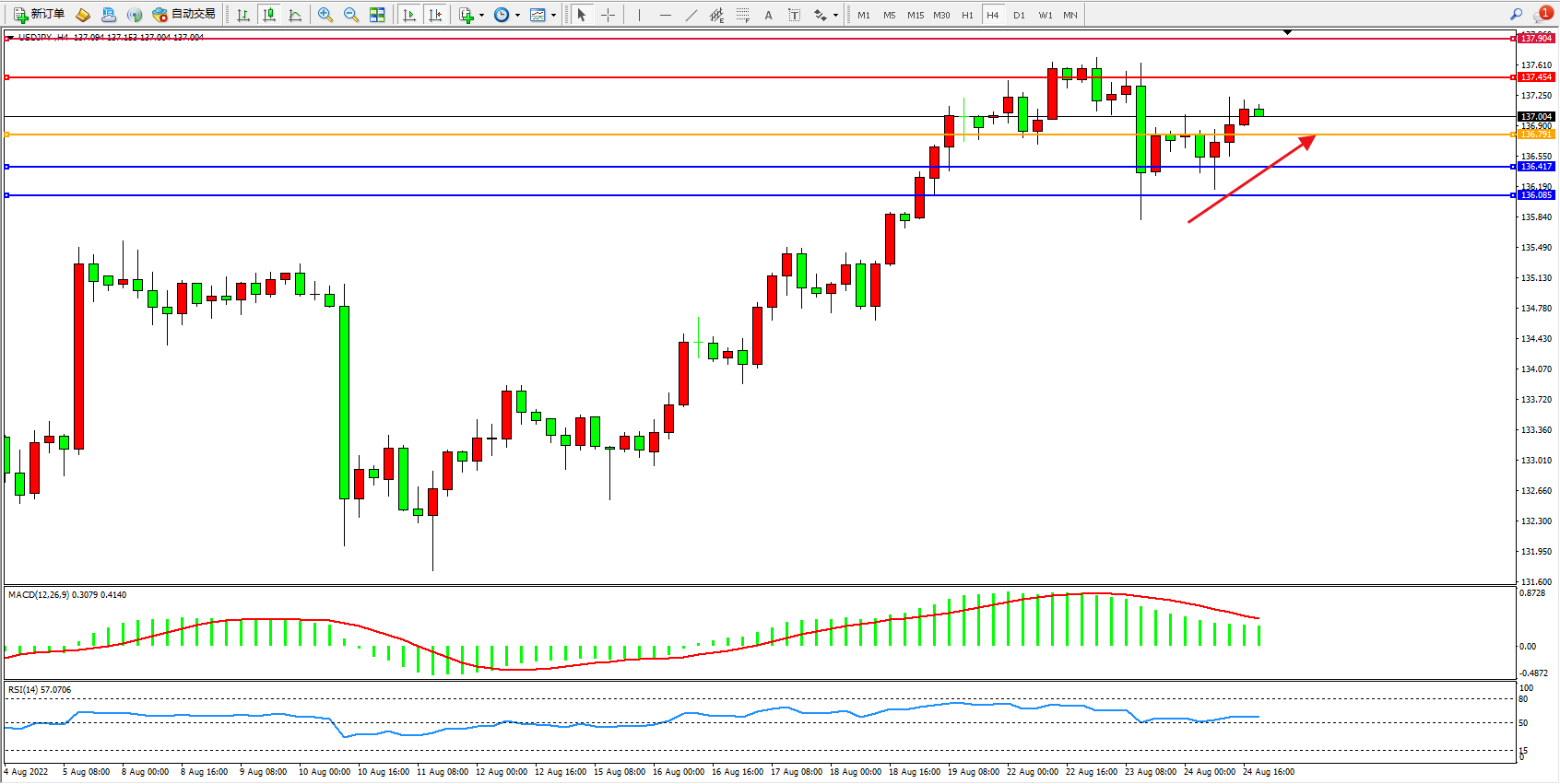 交易策略:136.791上方看涨,目标137.454、137.904