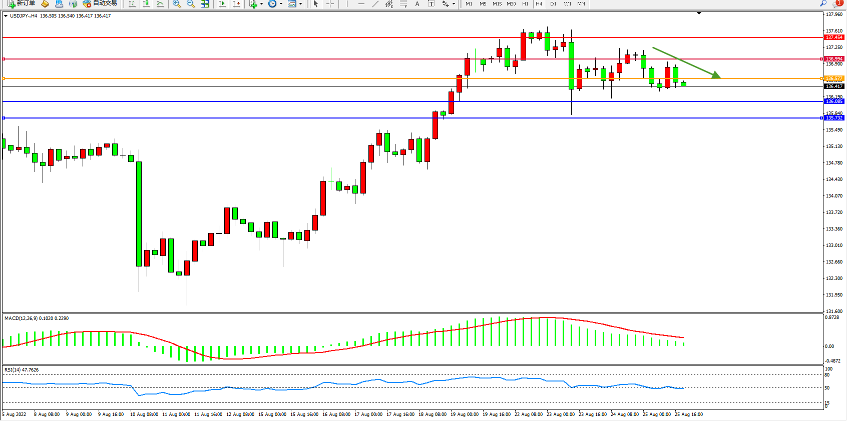 交易策略:136.577下方看跌,目标136.085、135.732
