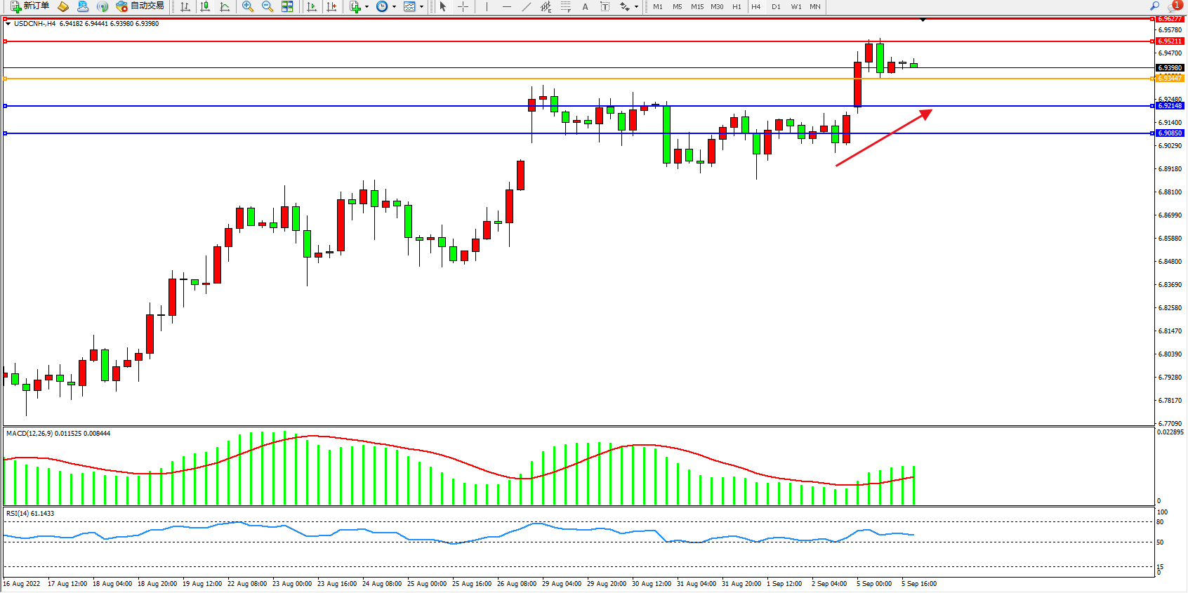 美元人民币USDCNH——4小时K线图显示:
