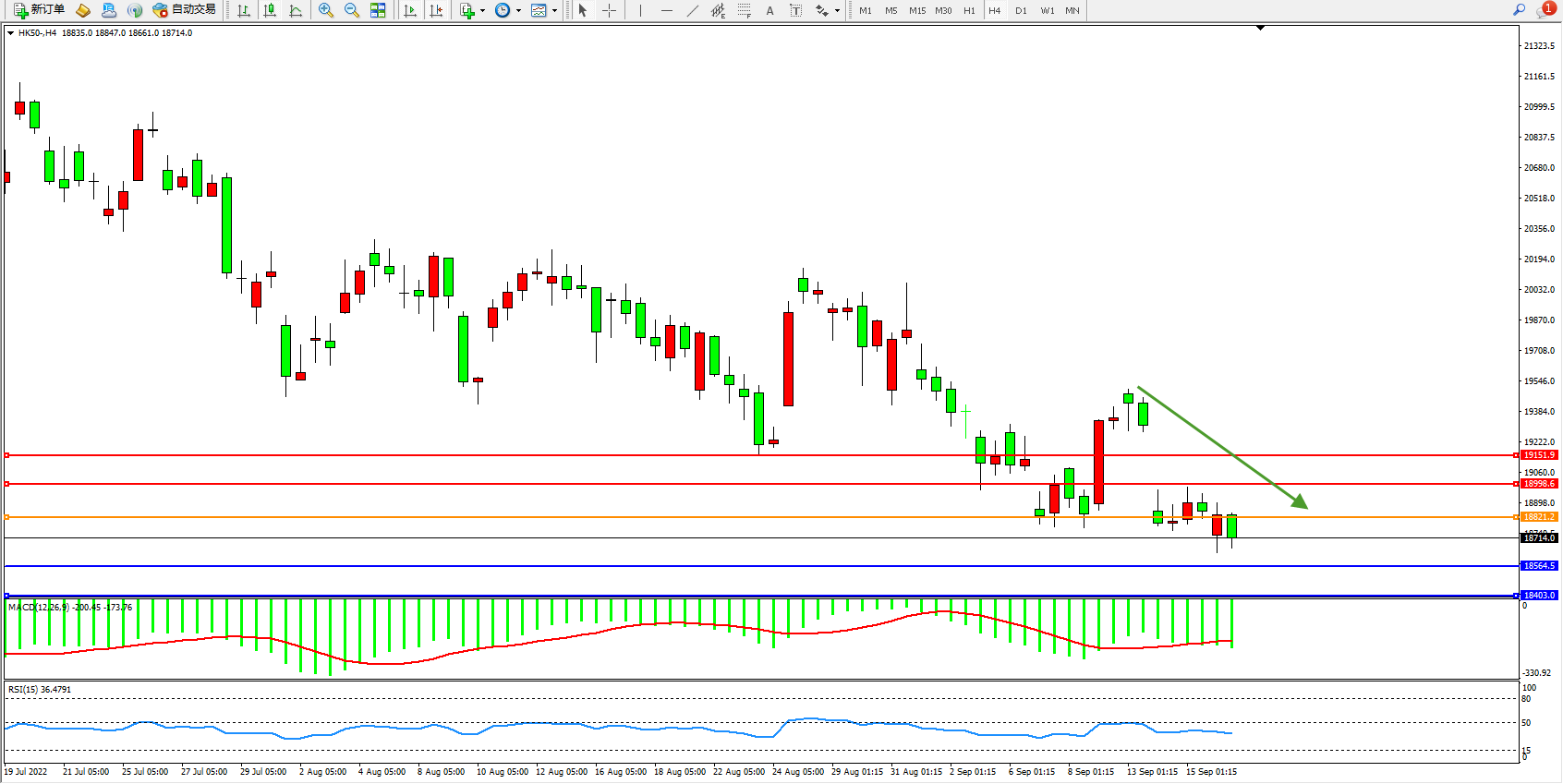 香港恒生指数9月16日(周五)收盘下跌168.69点,跌幅0.89%,报18761.69点;港股全天维持跌势,三大指数均刷新阶段低价。大型科技股继续下跌拖累大市走低,香港金管局总裁余伟文在2022财资市场高峰会表示,正与内地部门商讨以渐进式措施扩展南北理财通,包括:增加产品范围;发展离岸人民币衍生品市场,引入风险管理产品,满足投资者对冲需求;及加强人民币在股权交易中的使用,如南向交易以人民币计价的可行性。