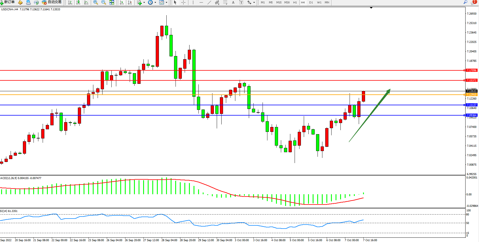 美元人民币USDCNH——4小时K线图显示: