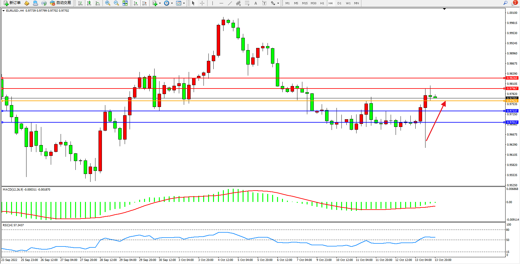 4小时图看:短期维持窄幅整理后开始巨震,多头动力伺机入场,强势上移,市场看涨情绪开始升温,MACD指标维持整理上移至0轴线附近徘徊,RSI指标处于50均衡线市场弱势整理;