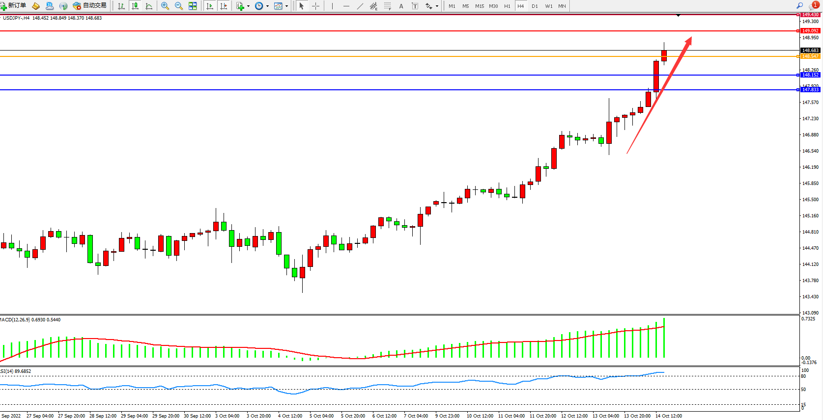 美元日圆USDJPY——4小时K线图显示: