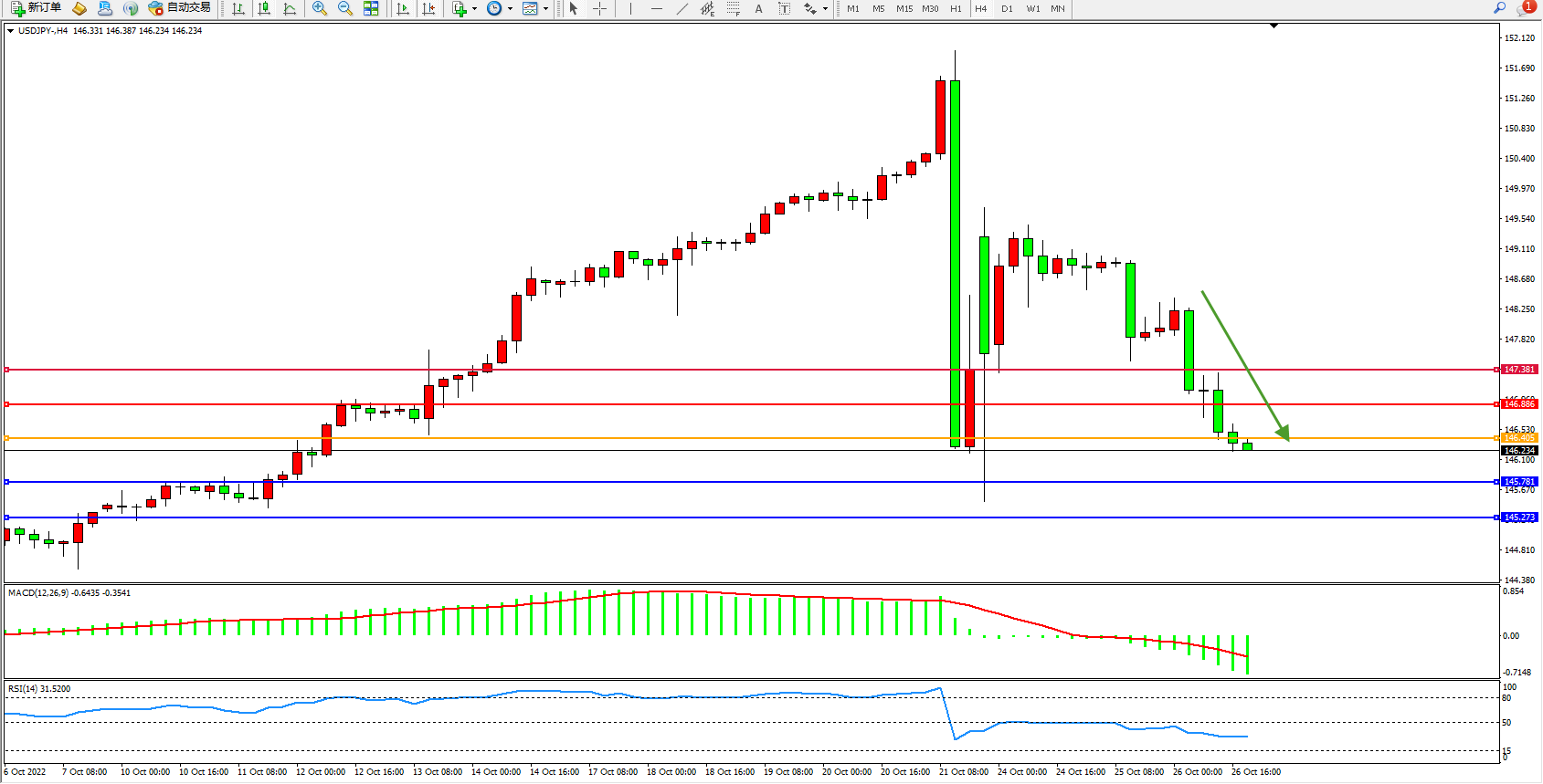 交易策略:146.405下方看跌,目标145.781、145.273