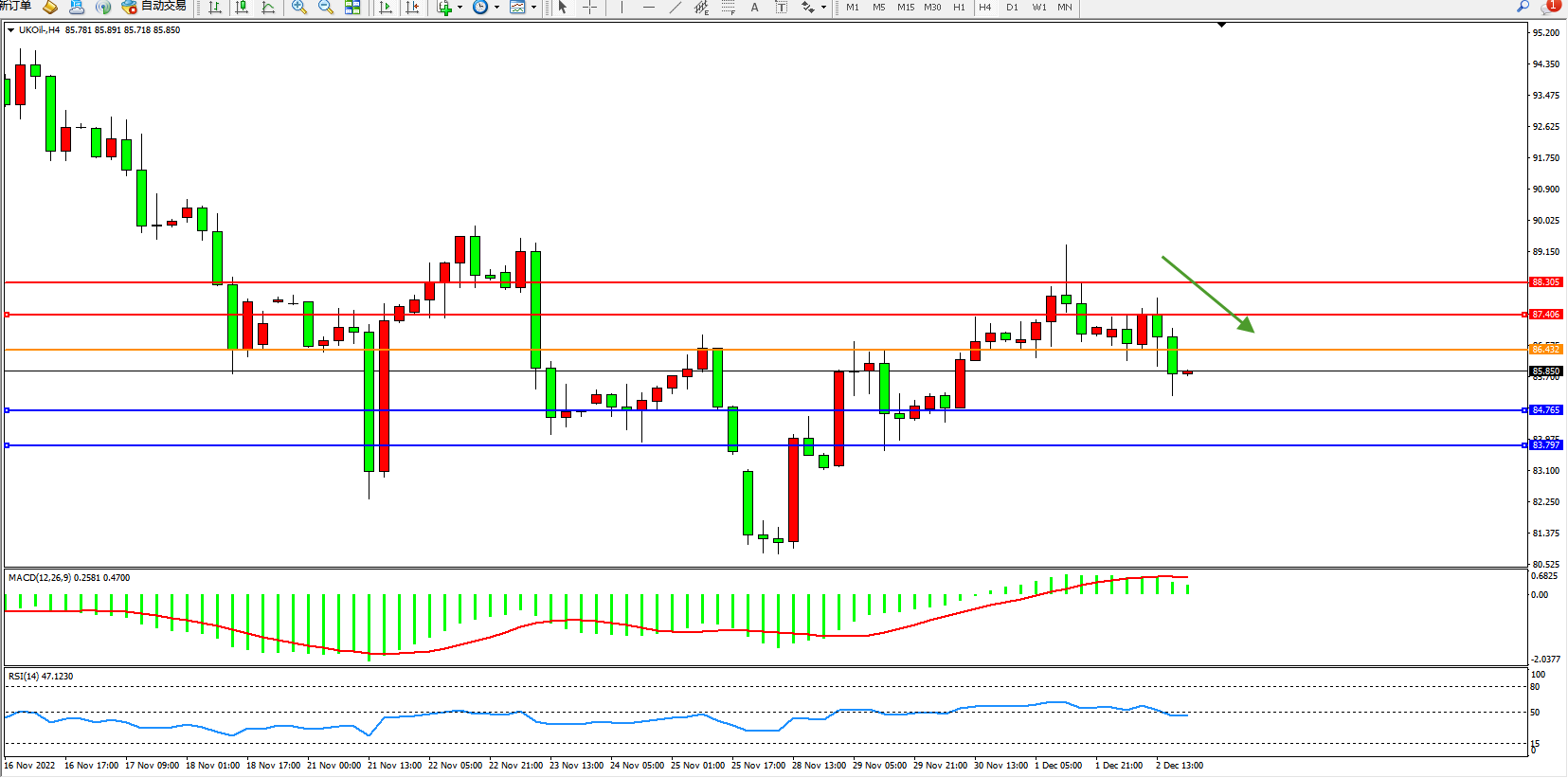 4小时图看:空头动力短期震荡下行,市场空头情绪开始缓慢入场,MACD指标处于0轴线上側整理,RSI指标处于50均衡线下侧弱势徘徊;