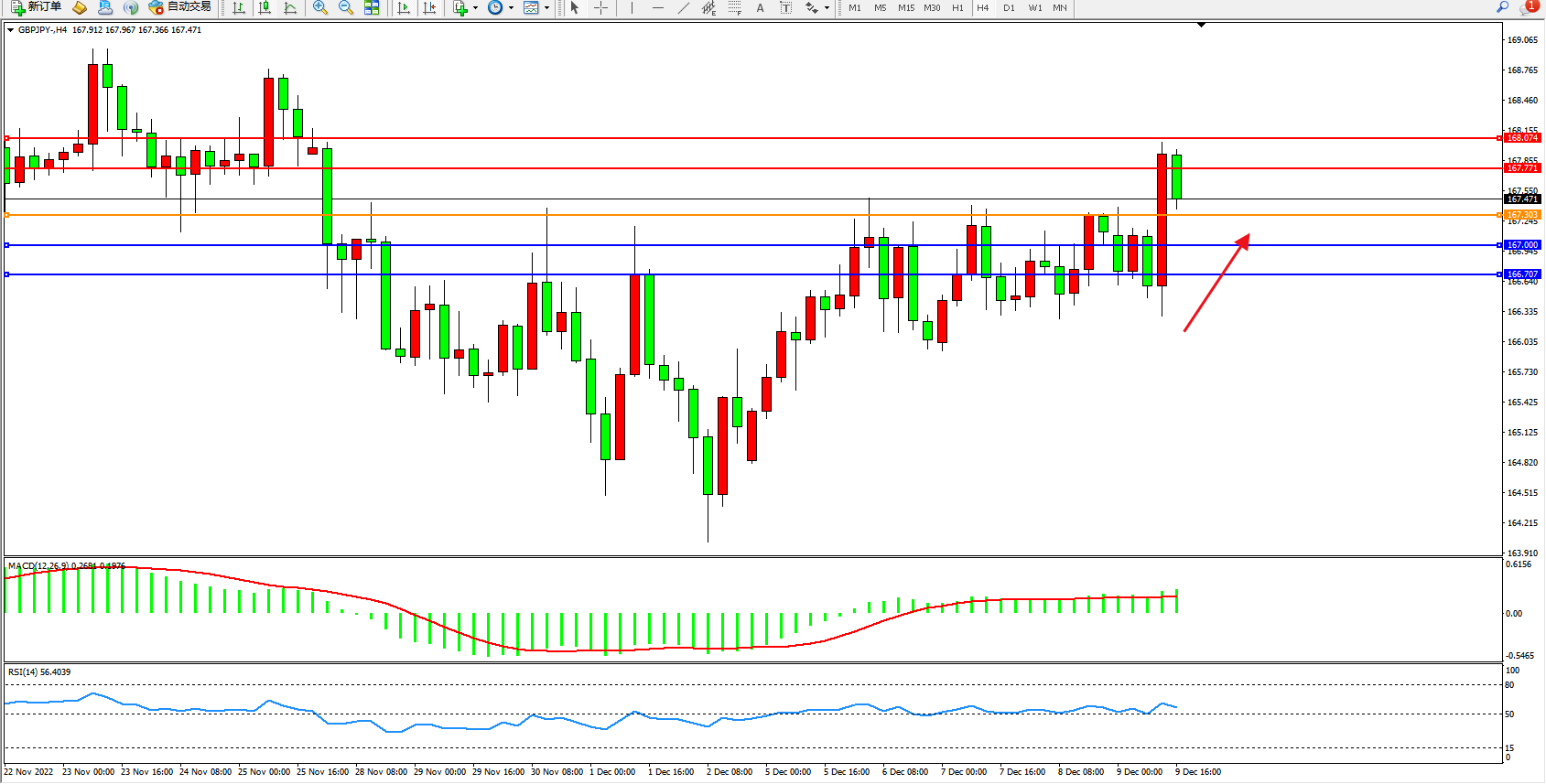 4小时图看:短期窄幅整理后,多头动力急速拉升,短期看涨情绪涌现,MACD指标处于多头区域整理,RSI指标处于50均衡线上側弱势震荡;