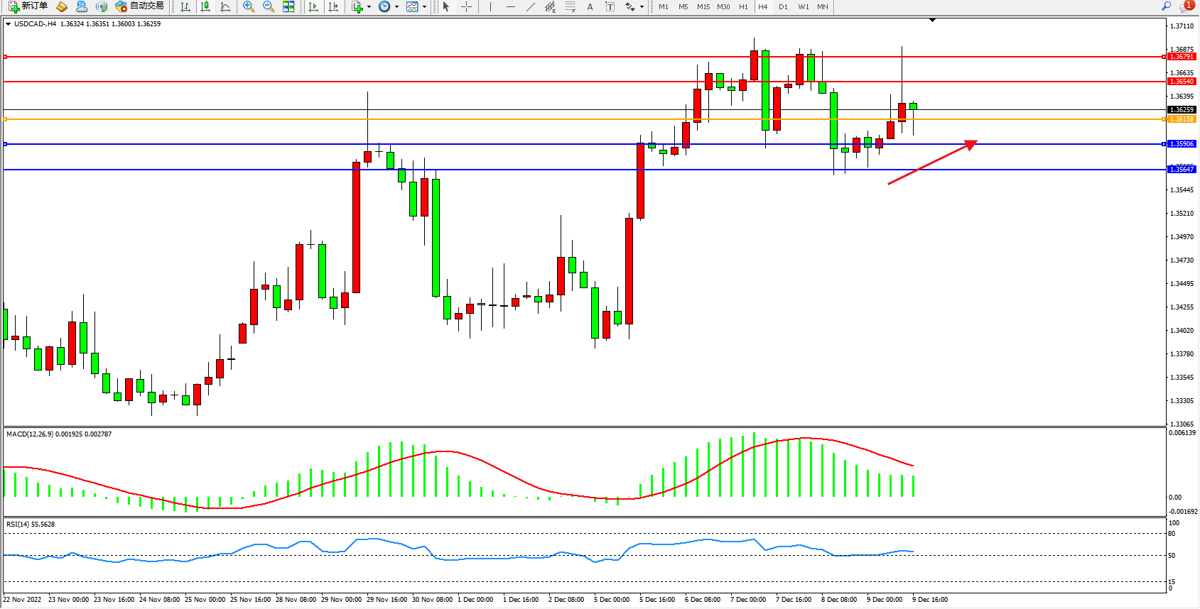 美元加元USDCAD——4小时K线图显示: