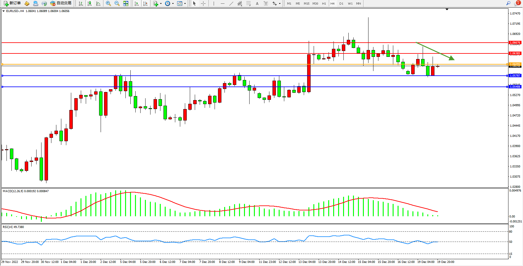 欧元美元EURUSD—4小时K线图显示: