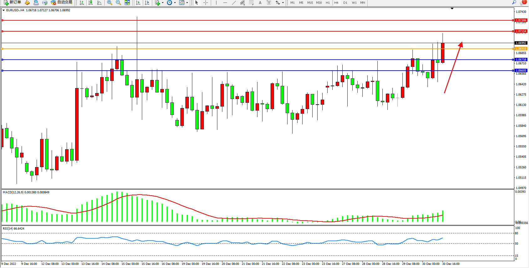 欧元美元EURUSD—4小时K线图显示: