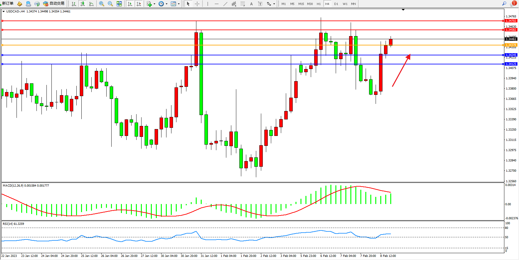 美元加元USDCAD——4小时K线图显示: