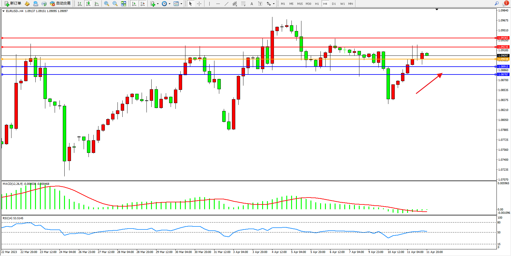 4小时图看:多头动力维持震荡上扬,短期看涨情绪依旧,市场多头不断攀升中,MACD指标处于0轴线附近弱势徘徊,RSI指标处于50均衡线附近弱势整理;