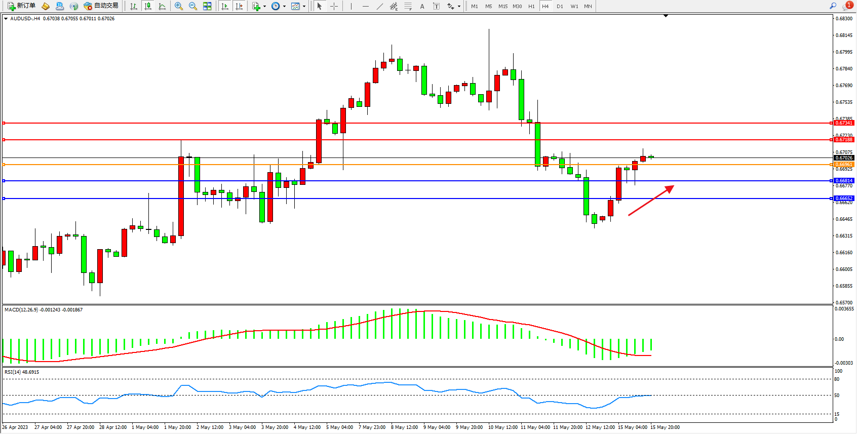 澳元兑美元维持0.67026附近震荡,澳洲国民银行周一提高了澳洲央行利率峰值的预测,预计至少需要再加息一次,使利率达到4.1%,才能使通胀率到2025年中恢复到目标水平。澳洲央行将于周二公布5月政策会议记录。