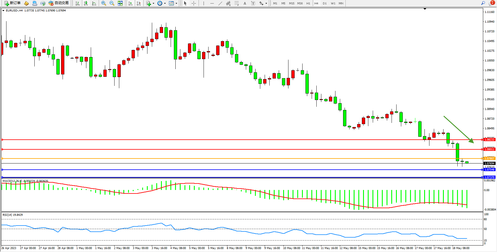 欧元美元EURUSD—4小时K线图显示:
