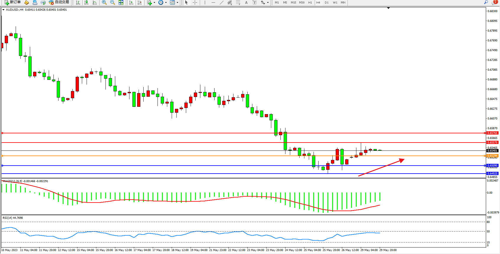 澳元美元AUDUSD——4小时K线图显示: