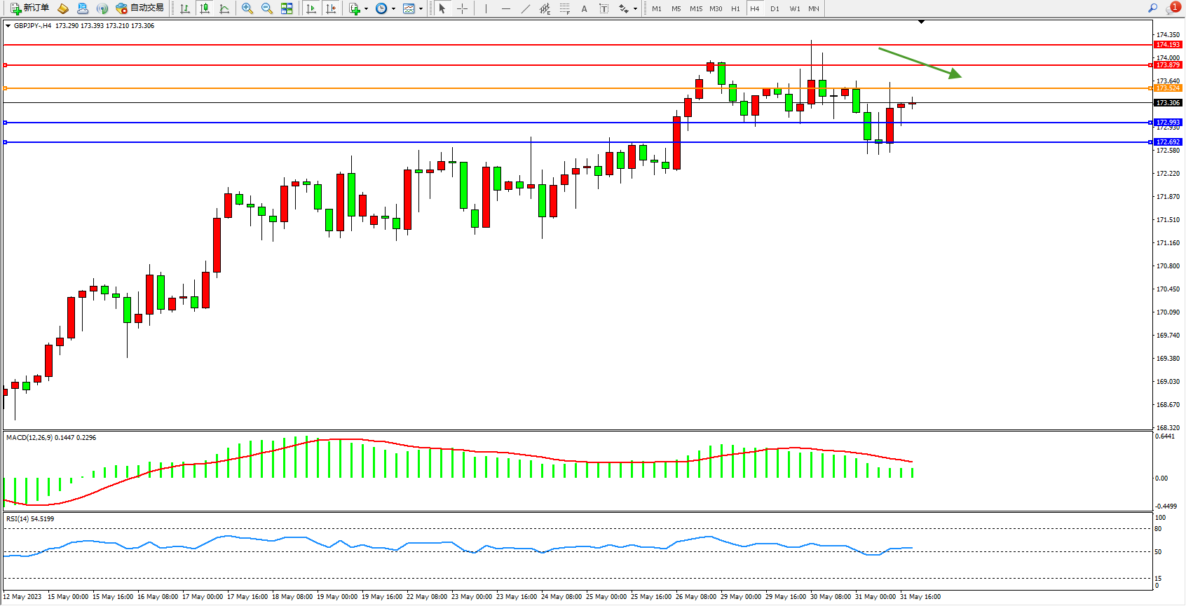 交易策略:173.524下方看跌,目标172.993  172.692