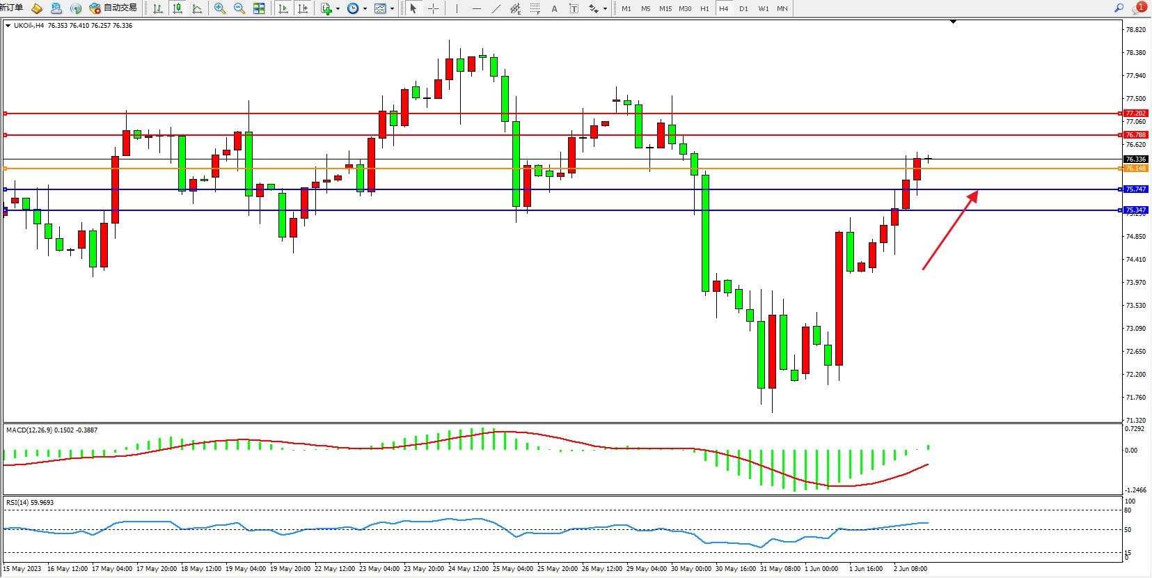 布油维持76.336附近震荡,美国国会通过债务上限法案。市场权衡石油输出国组织及其合作伙伴(OPEC+)进一步减产保价的可能性。