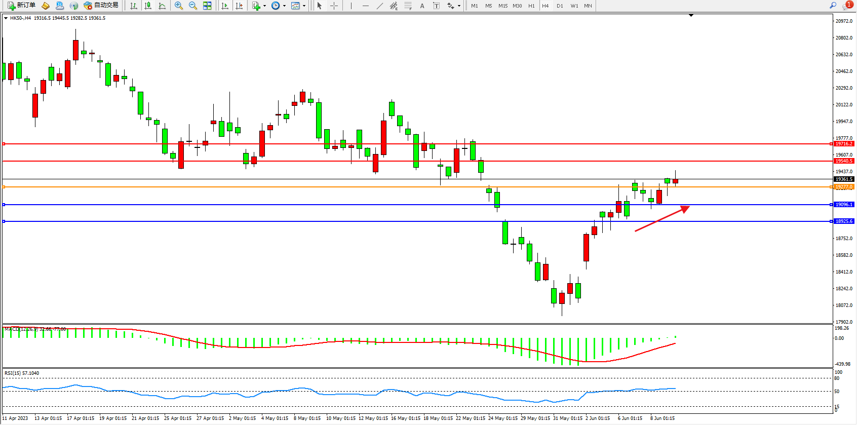 4小时图看:多头动力缓慢震荡向上移动,短期多头情绪持续,市场看涨态势良好,MACD指标维持震荡上移至0轴线上側徘徊,RSI指标处于50均衡线上側弱势整理;
