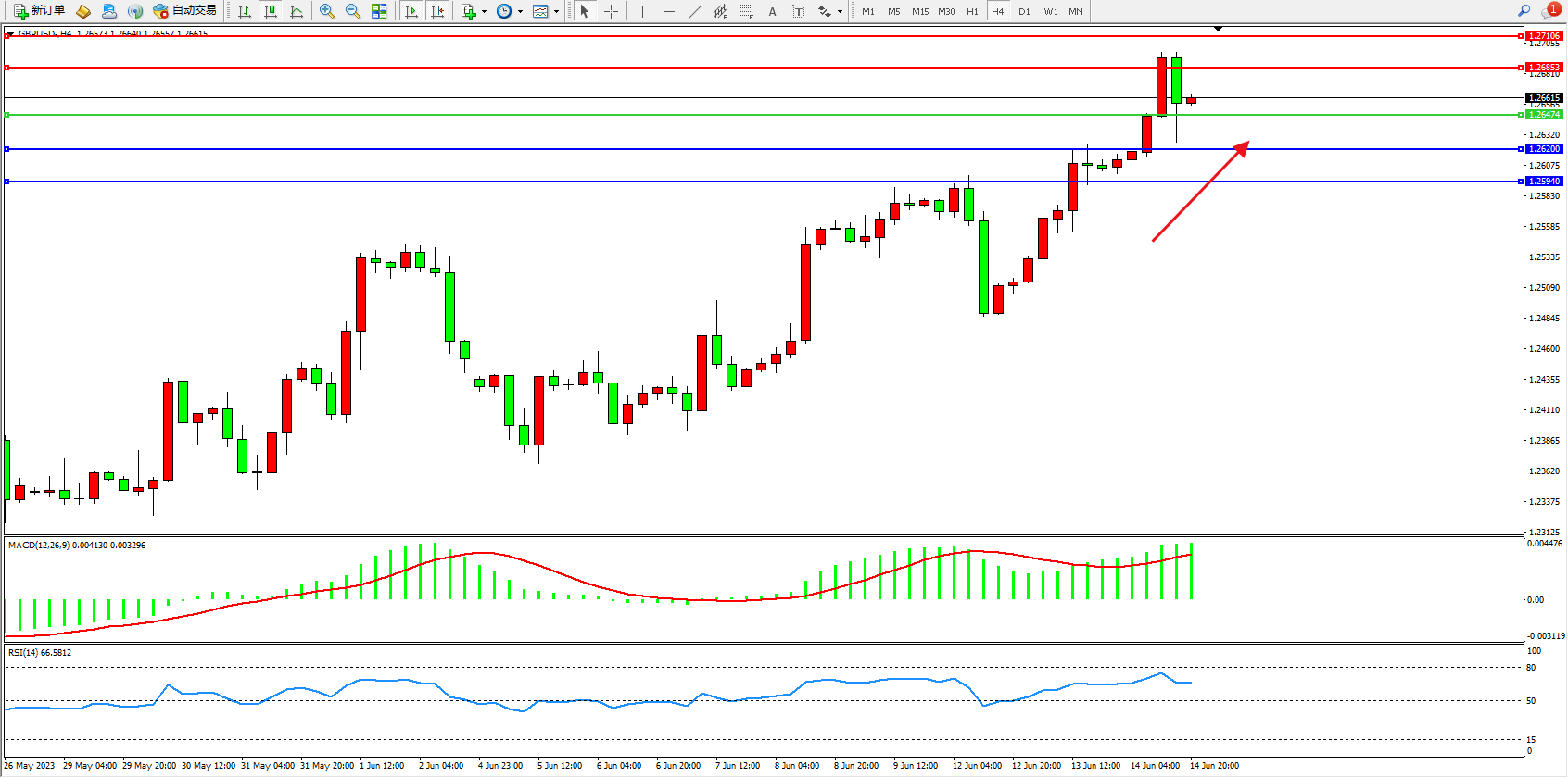 英镑兑美元维持1.26615附近震荡,英国5月就业数据强劲,利率市场加大对英国央行加息的押注,终端利率预期较昨日的5.5%,上升至5.80%。