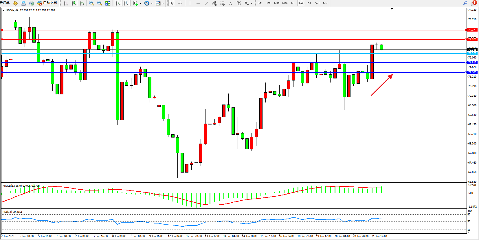 原油USOil——4小时K线图显示: