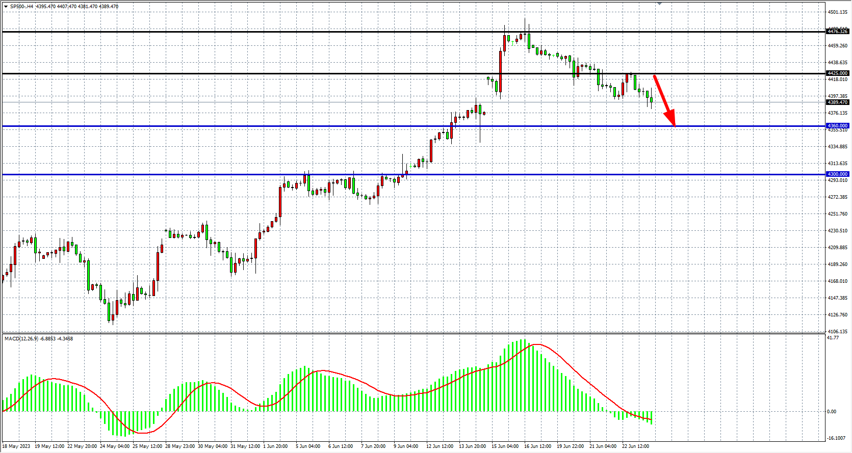 4小时图看,标普延续回落趋势,在4385附近暂时止跌,MACD量能在零轴下小幅放量,行情延续跌势,下方支撑4360-4300,压力4425-4475。