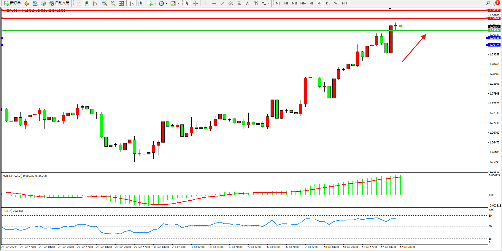 4小时图看:高位多头动力持续震荡上移,市场看涨情绪依旧,短期有继续向上移动态势,MACD指标处于多头区域高位整理,RSI指标处于多头区域高位震荡;