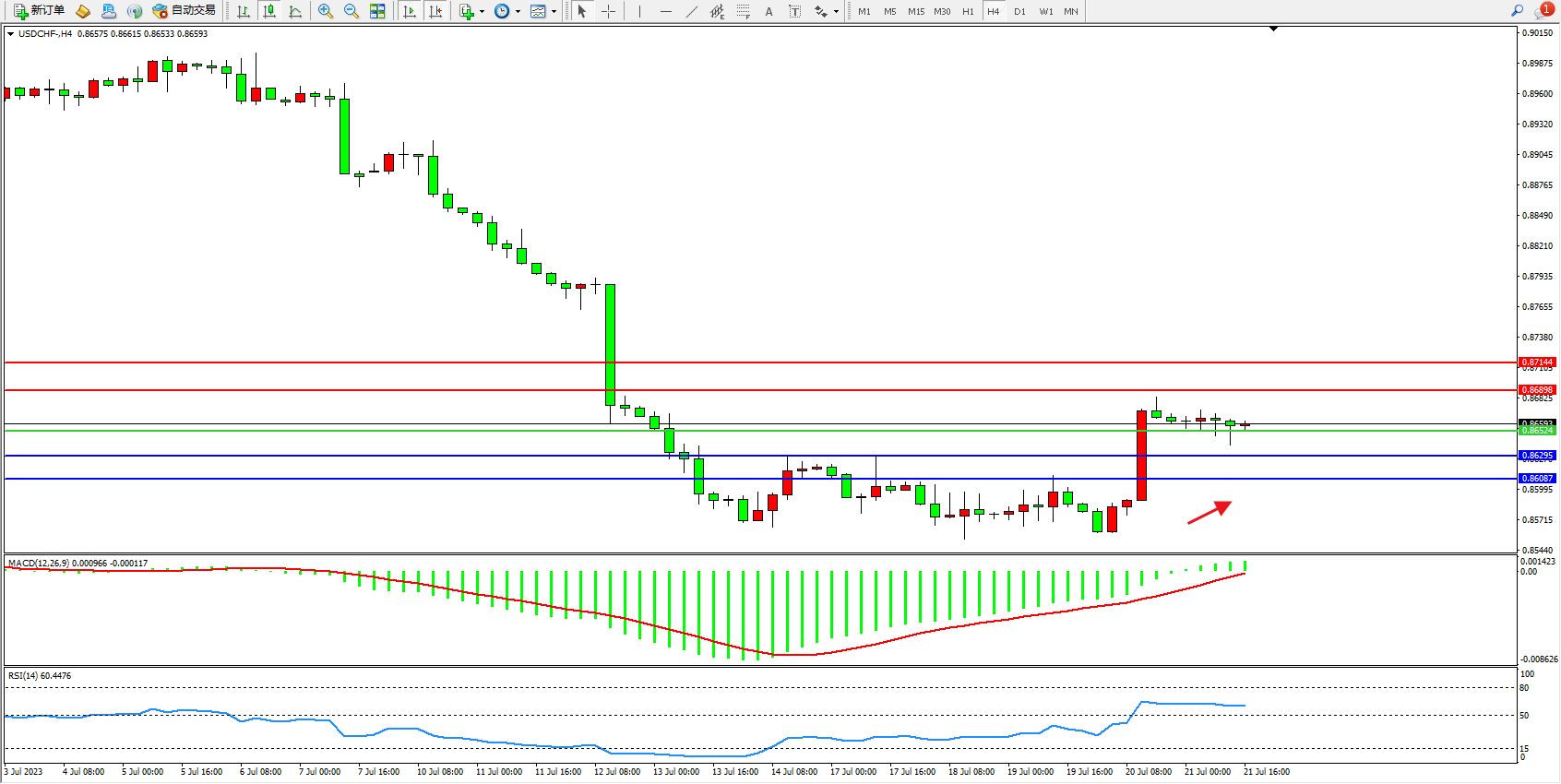 美元兑瑞郎维持0.86593附近震荡,美联储在下周货币政策会议上近乎铁定升息25个基点。投资者关注美联储主席鲍威尔会后发言,研判美联储将在多长时间内保持利率高位运行。
