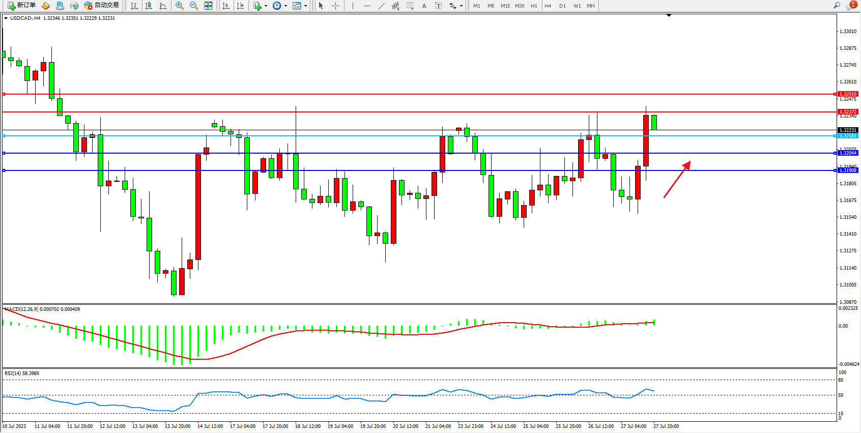 美元加元USDCAD——4小时K线图显示: