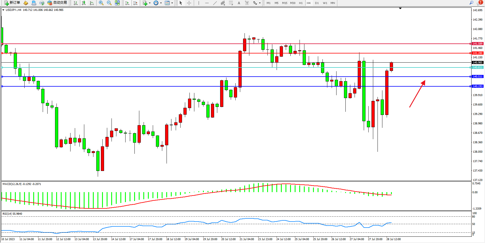 4小时图看:多头动力强势拉升,市场多头情绪笼罩,短期有继续向上移动态势,MACD指标处于0轴线下侧弱势整理,RSI指标处于50均衡线上側弱势徘徊;