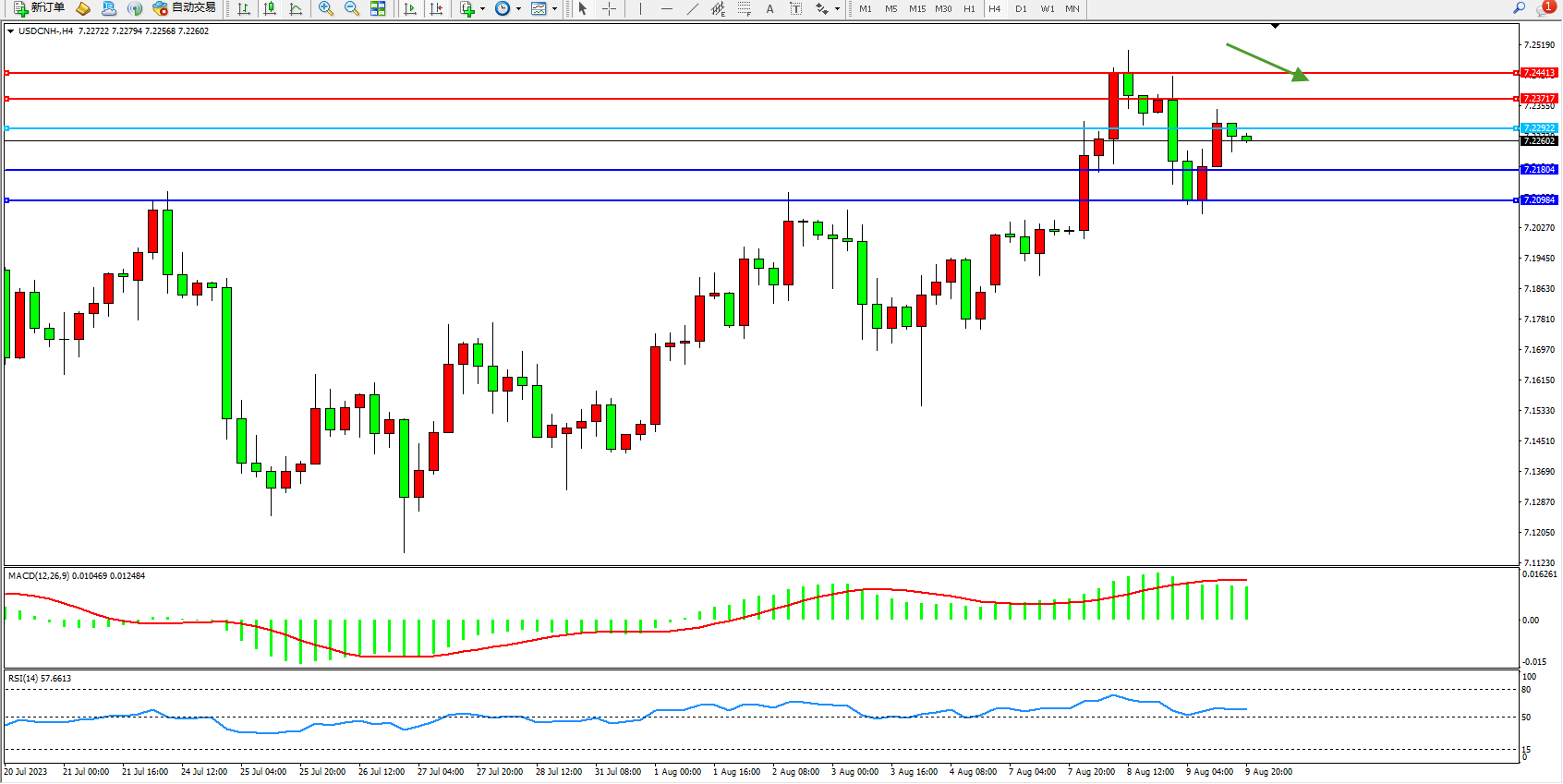 备选策略:7.22922上方看涨,目标7.23717  7.24413