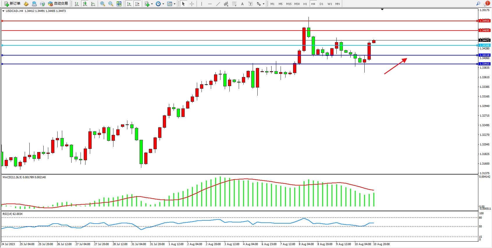 美元加元USDCAD——4小时K线图显示: