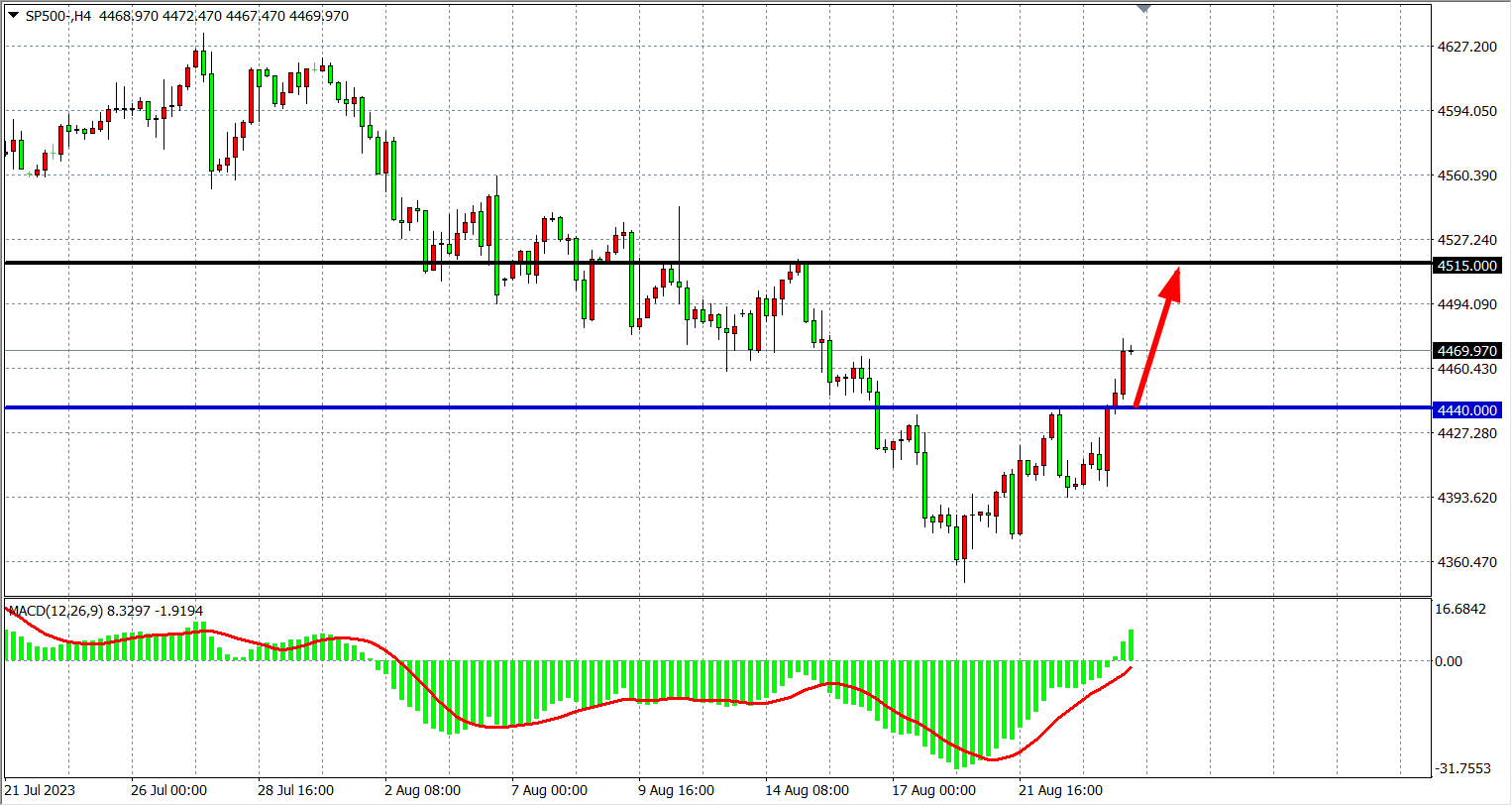 4小时图看,标普一鼓作气上破4440的前高压力,MACD量能上穿零轴放量,行情走势仍转为多头,支撑关注4440附近,阻力关注4515-4560。