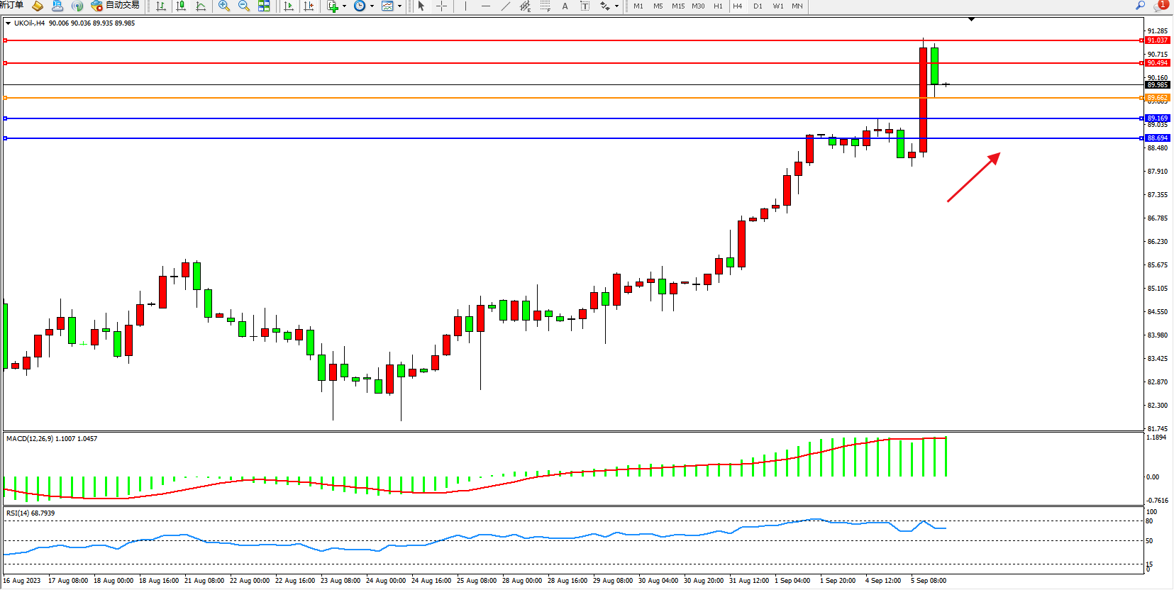 布油维持89.985附近震荡,全球市场风险人气低迷,中国和欧洲经济数据令人失望,布伦特原油6个交易日来首次下跌,走低0.9%,至每桶88.22美元,远离最近触及的9个月高点,原因是市场预期欧佩克+产油国集团将进一步减产。