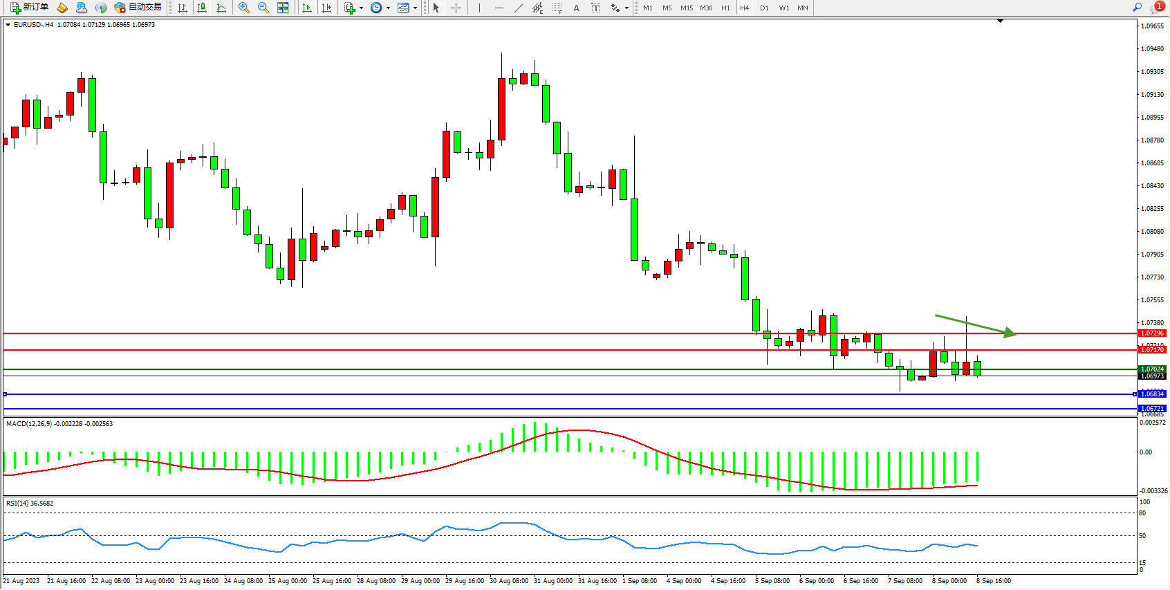 欧元美元EURUSD—4小时K线图显示: