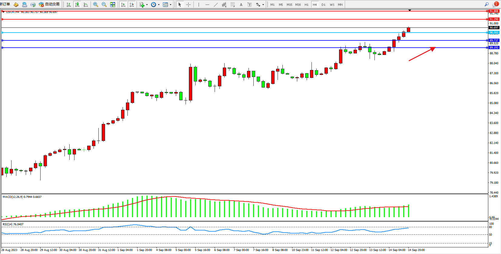 原油USOil——4小时K线图显示: