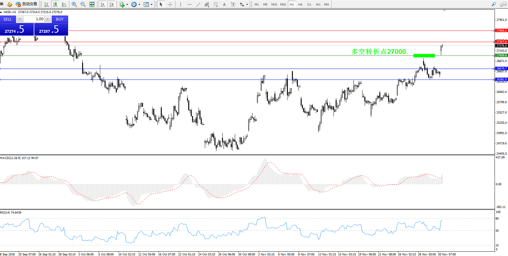 技术点评:受其市场资讯影线,恒指早间大幅高开高走,多头上升趋势延续中,MACD指标0轴上方多头区持续上攻走势,RSI指标多头区域上攻至80均衡线下方,;