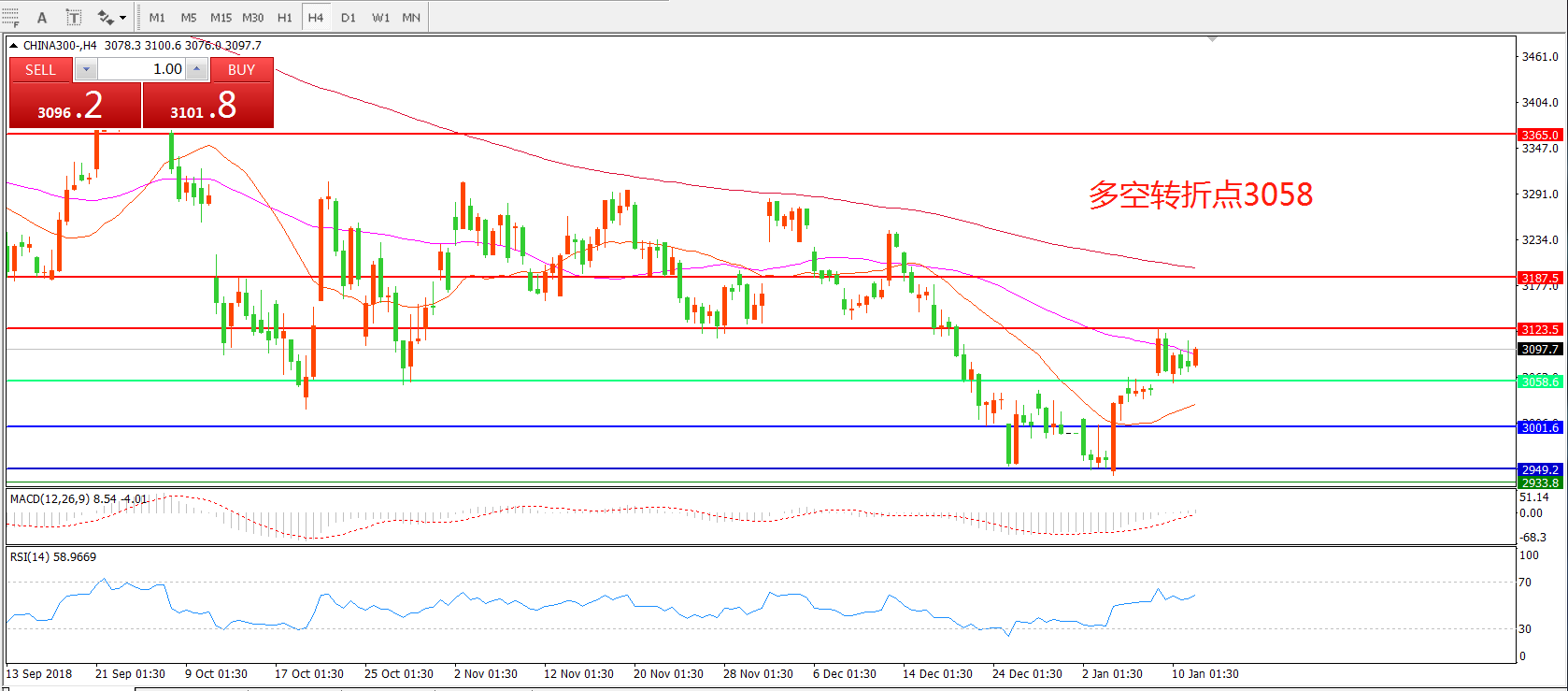 1小时图看,CHINA300中华指数收复3000后陷入整理,均线系统走平, MACD绿柱减少,短期反弹成为可能,中期仍以震荡思路对待。