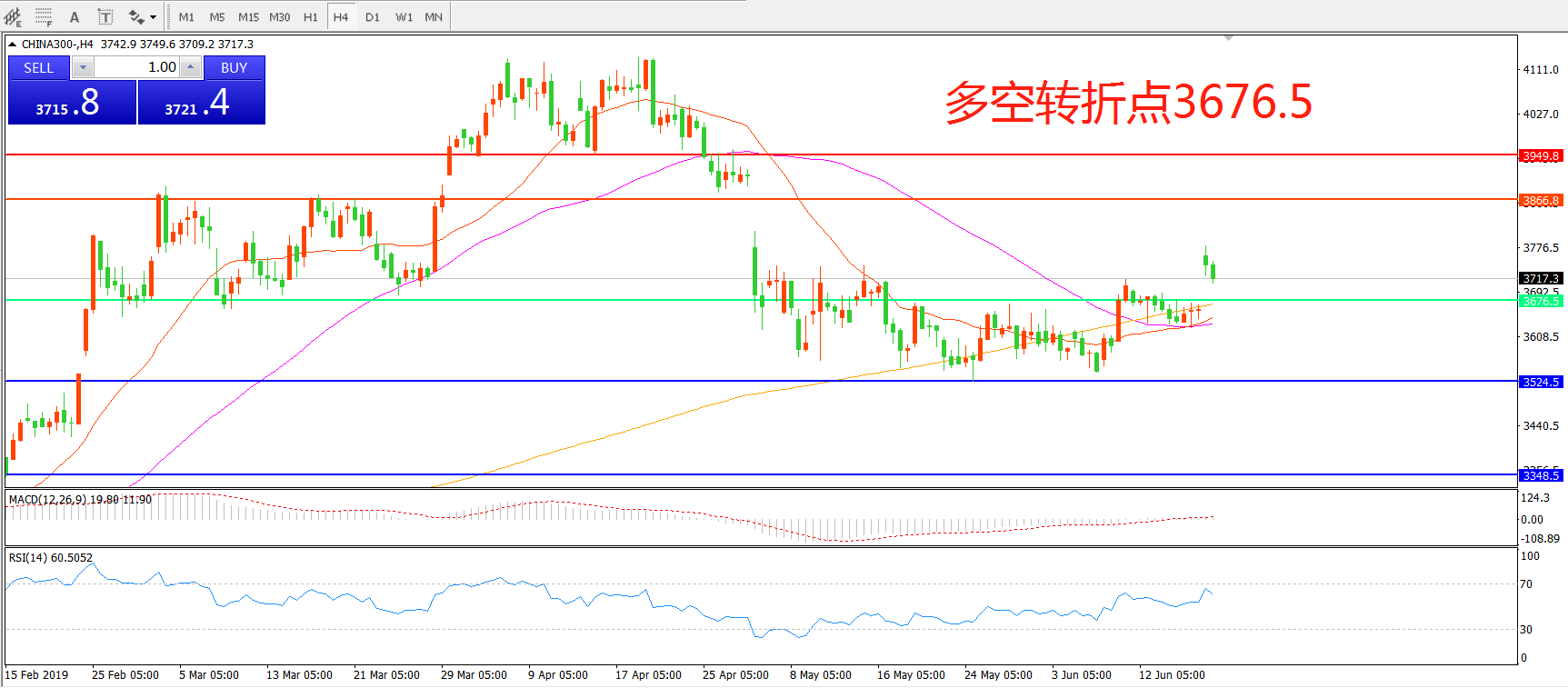 4小时图看,沪深300指数冲高回落,依然维持3676.5一线整理,整体方向仍然偏向震荡,均线系统粘合形成下方支撑,MACD绿柱缩短,RSI指标拐头向下,日内延续震荡概率较大。