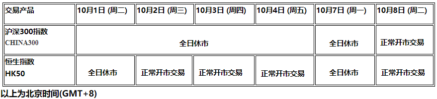 由于中国国庆节和重阳节假期休市影响,以下中国大陆沪深交易所及中国香港交易所HKEX股指产品的交易时间将受假期影响休市,敬请阁下留意知悉!