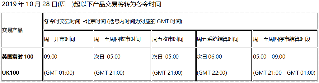欧洲时区将于2019年10月28日(周一)及美国时区将于2019年11月4日(周一)开始分别转为冬令时交易时间。