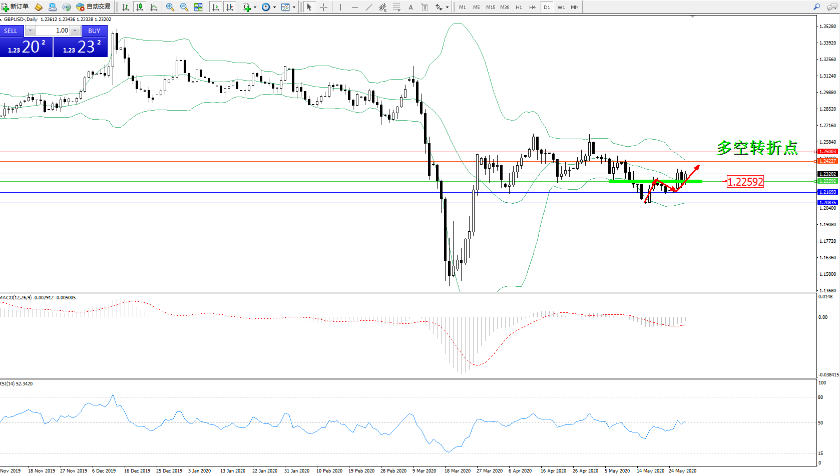 交易策略:1.22592上方看涨,目标1.24227、1.25003