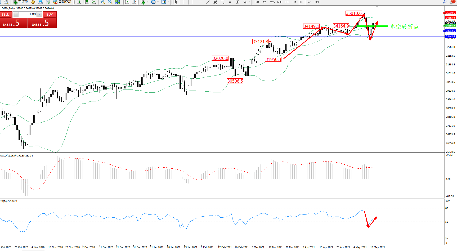 技术点评:多头动力延续布林带指标通道中上轨区间持续震荡上扬,高位抵达35010位置后遇阻回撤,跌破下轨后得到支撑开始反转回升,再度回升至中上福区间震荡,多头动力仍具强劲动力,关注中轨附近节点,MADC指标处于多头区域高位震荡后维持弱势整理,RSI指标空头动力急速下挫至50均衡线附近震荡再度回升中;