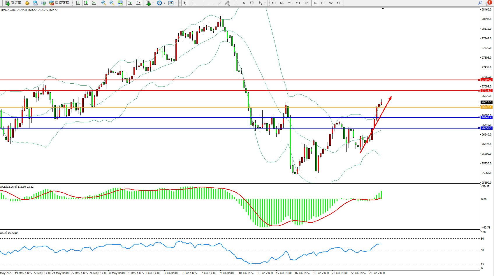 日经225指数6月24日(周五)收盘上涨328.25点,涨幅1.25%,报26499.50点。日本5月核心消费者通胀年率连续第二个月超过央行的目标,这凸显出全球原材料成本飙升给日本脆弱经济带来的压力加剧。