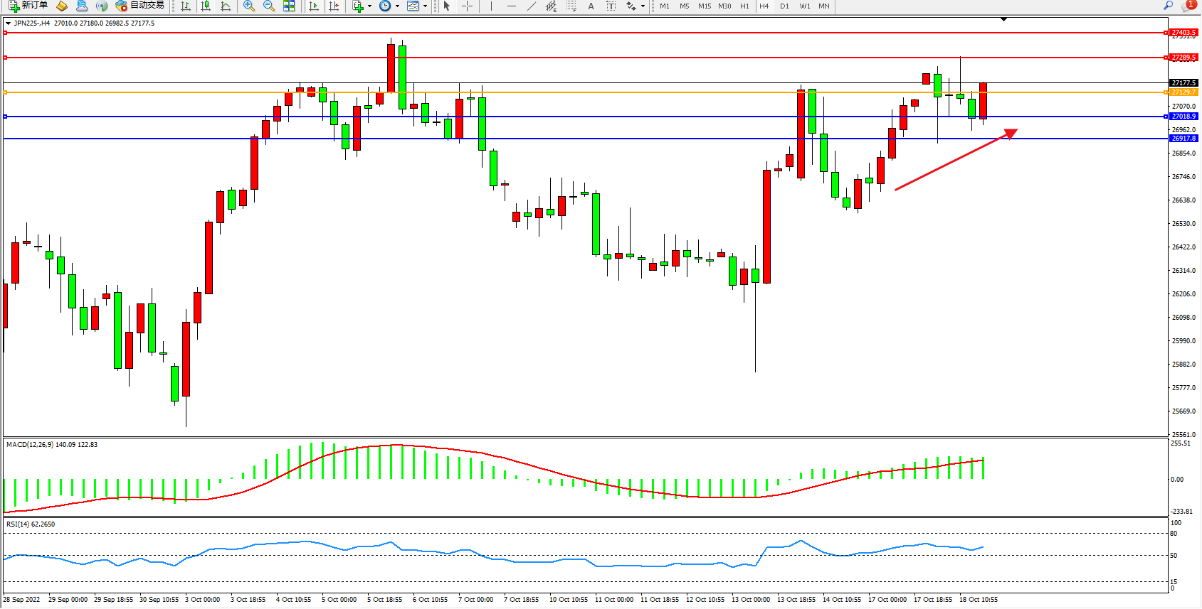 日经225指数10月18日(周二)收盘上涨389.71点,涨幅1.46%,报27165.50点。日本央行行长黑田东彦:日本央行的宽松政策已经对结束通货紧缩状态产生了影响。不打算辞去日本央行行长一职。QQE政策不是失败的,因为它有助于刺激增长,创造就业。现在不考虑改变政府和日本央行在经济政策上的协议。