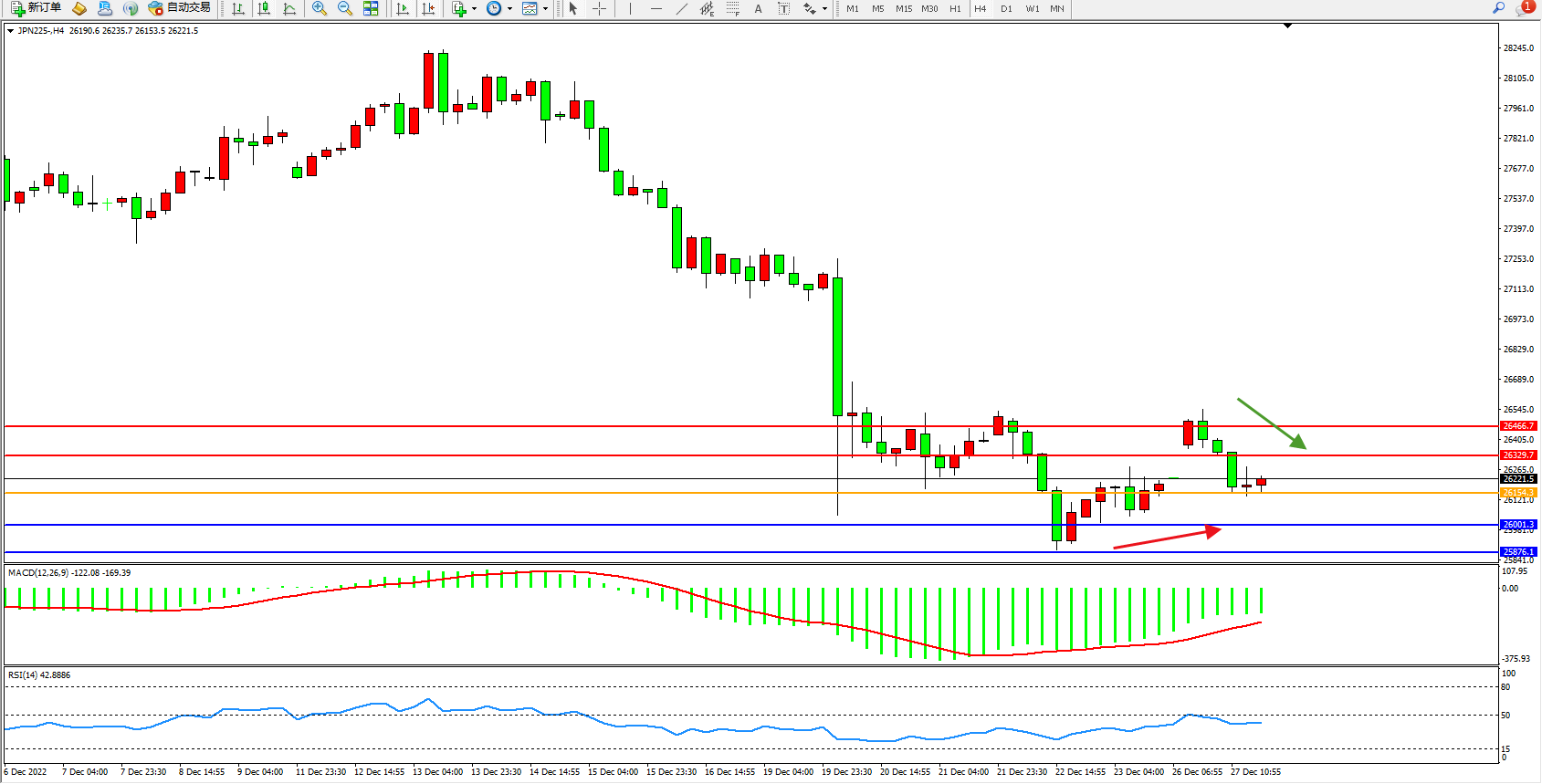 日经225指数12月27日(周二)收盘上涨219.25点,涨幅0.84%,报26454.50点。市场消息:由于日本央行搅动市场,日本顶级银行家预计日本的负利率政策将保持不变。日本20年期国债收益率升至日本央行最后一次无限量购债时的水平。