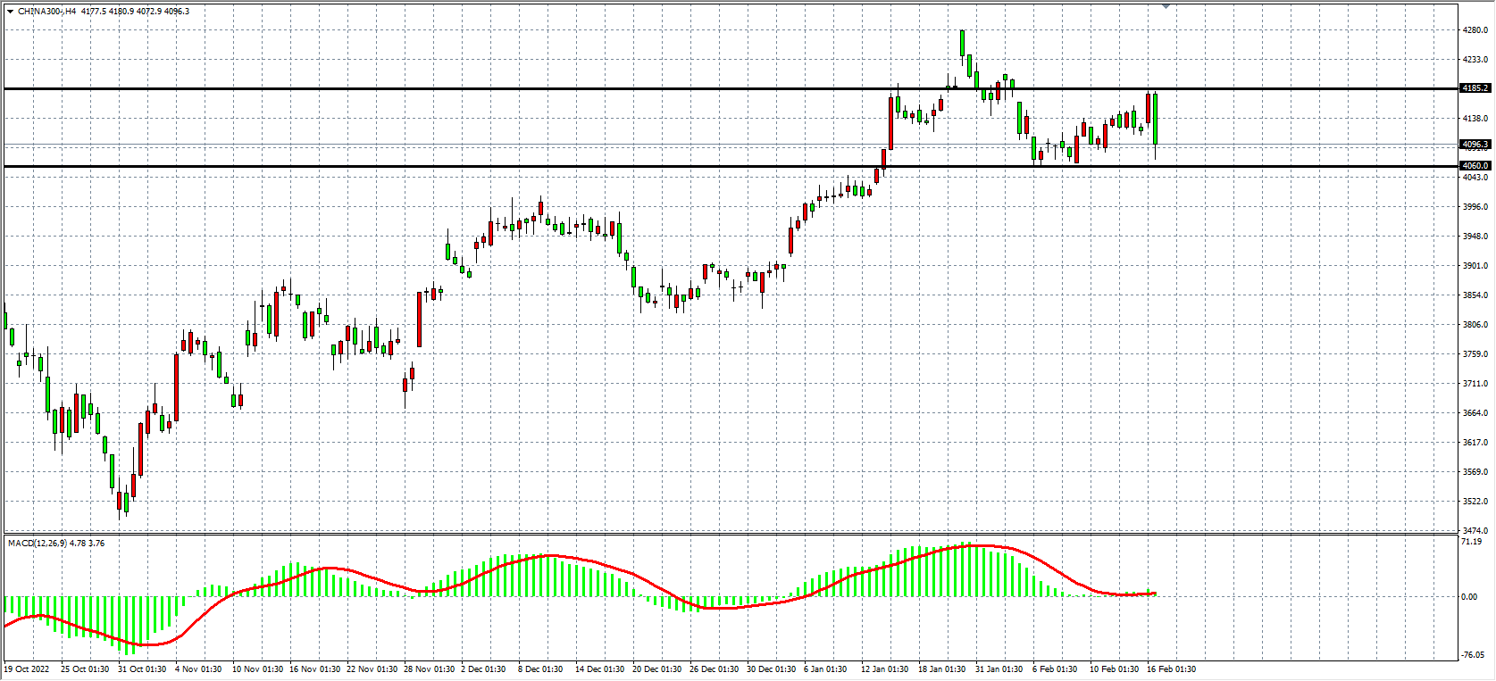 4小时图看,沪深300在反弹4180之后受阻明显,出现大阴线回落形成看涨吞没,同时MACD于零轴之上缩量明显,当前支撑关注4090,压力关注4185,高抛低吸为主。
