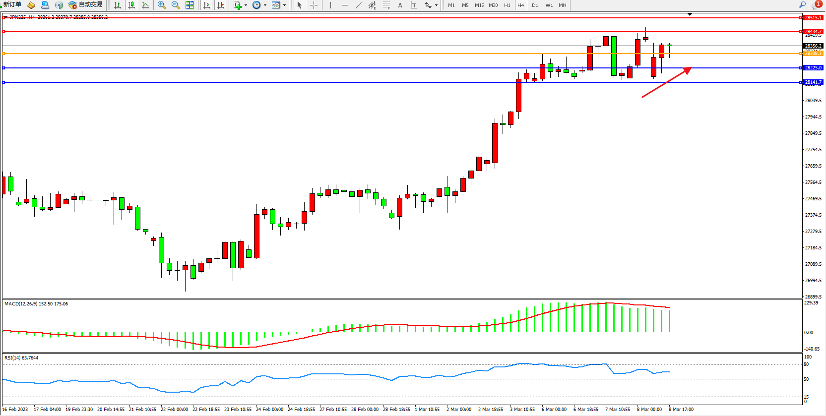 4小时图看:高位窄幅震荡,市场整体处于高位徘徊,短期或延续多头情绪,MACD指标处于多头区域高位徘徊,RSI指标处于多头区域整理;